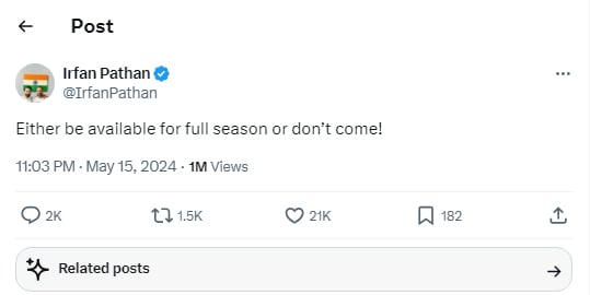 سماجی رابطے کی سائٹ ایکس (ٹوئٹر) پر ٹوئٹ کرتے ہوئے سابق کرکٹر عرفان پٹھان نے لکھا کہ ’’یا تو پورے سیزن کیلئے دستیاب ہوں یا نہ آئیں!‘‘۔