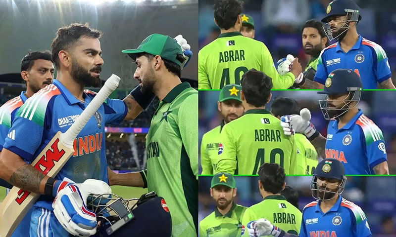 مذکورہ روایتی حریفوں کے مابین اس میچ کے دوران، ابرار احمد اور ویرات کوہلی دونوں نے اس مصافحہ کیا جب اسپن بولر نے اپنا 10 اوورز میں 28 رنز کے عوض ایک وکٹ حاصل کرتے ہوئے اپنا اسپیل مکمل کیا تھا۔