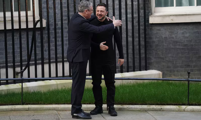 یوکرینی صدر زیلنسکی ہفتے کے روز لندن میں وزیر اعظم کی رہائش گاہ 10 ڈاؤننگ اسٹریٹ کے باہر پہنچے تو وہاں موجود شہریوں نے یوکرین کی حمایت میں نعرے لگائے، اس موقع پر وزیر اعظم اسٹارمر نے انہیں گلے لگایا اور اندر لے گئے۔