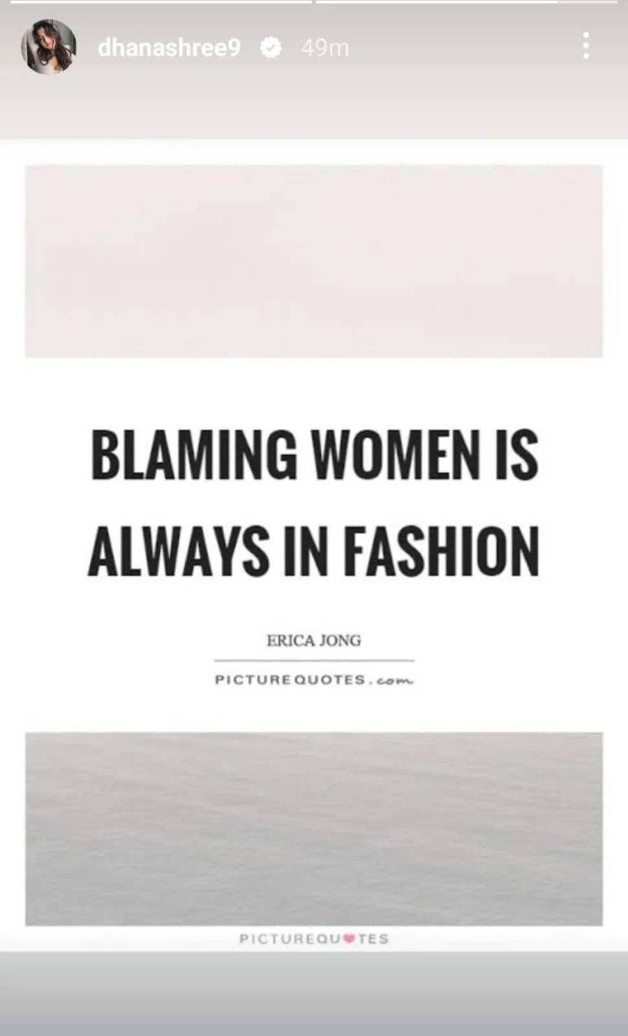 دھناشری ورما نے گزشتہ روز انسٹاگرام پر ایک سٹوری شیئر کی جس میں درج تھا کہ ’عورت کو الزام دینا ہمیشہ فیشن رہا ہے‘۔