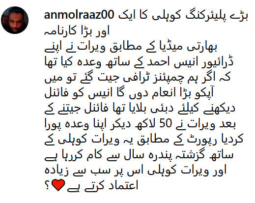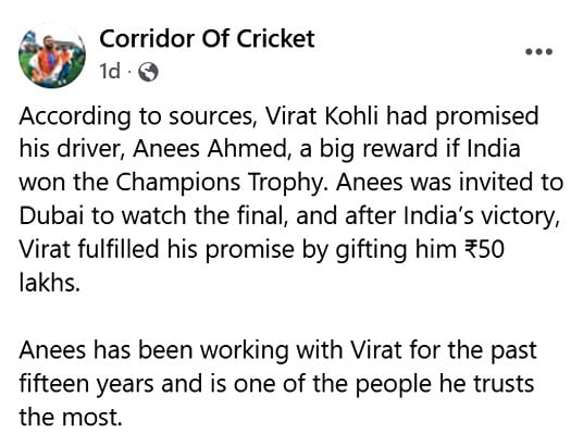 سوشل میڈیا پوسٹس کے مطابق، ویرات کوہلی نے اپنے ڈرائیور انیس احمد سے وعدہ کیا تھا کہ اگر بھارت چیمپئنز ٹرافی جیت گیا تو وہ انہیں 50 لاکھ روپے انعام دیں گے۔