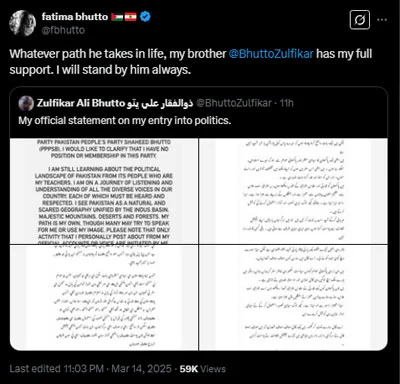انہوں نے بھائی کے پیغام کو ری شیئر کرتے ہوئے لکھا ہے کہ میرے بھائی ذوالفقار علی بھٹو جونیئر زندگی میں جو بھی راستہ اختیار کریں، انہیں میری مکمل حمایت حاصل ہے۔