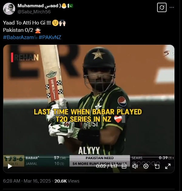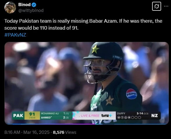 ایک صارف نے لکھا کہ آج پاکستانی ٹیم نے واقعی بابراعظم کو بہت یاد کیا ہوگا، ورنہ اسکور 110 ہوتا۔
