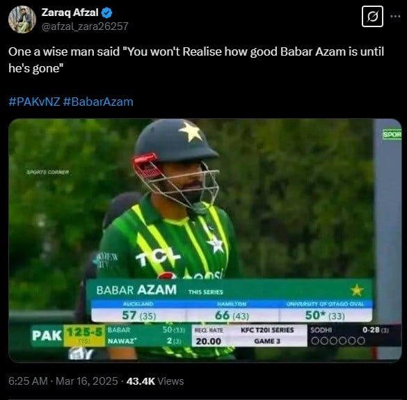 اس ناقص بیٹنگ پرفارمنس پر سوشل میڈیا پلیٹ پر فارمز پر مداحوں نے سست اسٹرائیک ریٹ سے کھیلنے والے بابراعظم کی کمی کو محسوس کیا اور دلچسپ رائے کا اظہار کیا۔