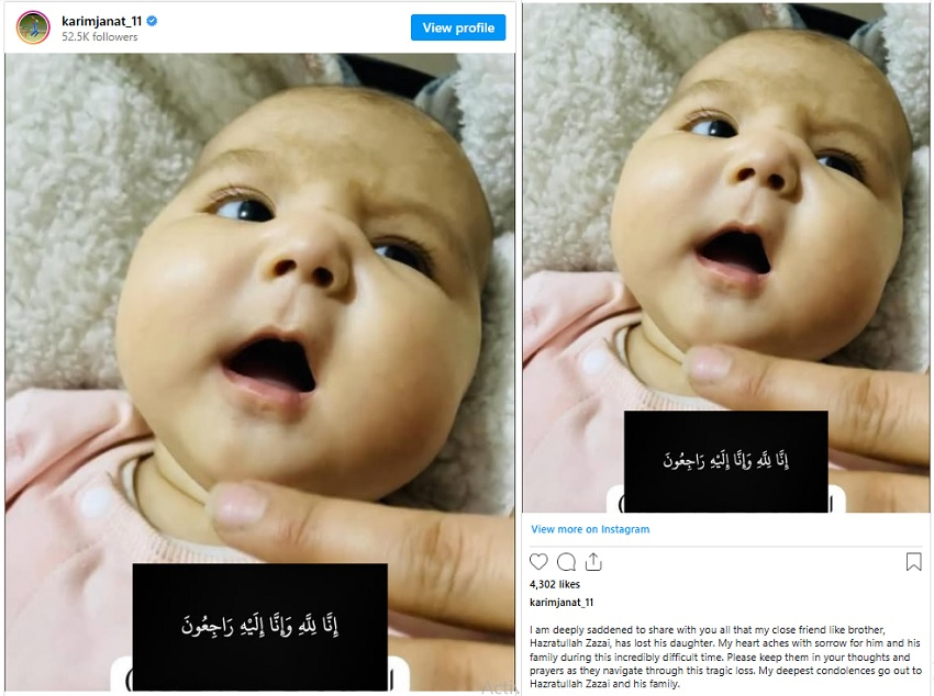 پوسٹ میں کریم جنت نے اس مشکل گھڑی میں حضرت اللہ زازئی اور ان کے اہلخانہ سے گہرے دکھ اور تعزیت کا اظہار کیا۔ انہوں نے لکھا کہ ’’میرے بھائی حضرت اللہ زازئی کی بیٹی انتقال کرگئی ہے‘‘۔