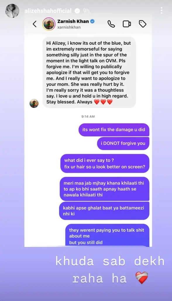 اب کچھ عرصہ گزرنے کے بعد اپنی غلطی کا احساس ہونے پر زرنش خان نے حال ہی میں علیزے شاہ کو اپنے الفاظ پر معافی مانگتے ہوئے انسٹاگرام پر ایک پرائیویٹ میسج بھیجا ہے۔