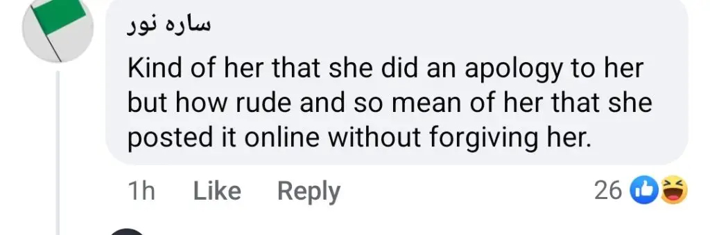 جس میں زرنش نے لکھا، ’ہیلو الیزے، مجھے معلوم ہے کہ میں اس وقت کچھ احمقانہ بات کہہ گئی تھی مگر میں معذرت خواہ ہوں آپ کی والدہ کو بھی اس سے تکلیف پہنچی تھی میں آپ کی ماں سے بھی معذرت خواہ ہوں، اگر آپ مجھے معاف کر دو تو اس کیلئے میں عوامی طور پر معافی مانگنے کیلئے بھی تیار ہوں میں آپ سے پیار کرتی ہوں، ہمیشہ خوش رہیں۔”