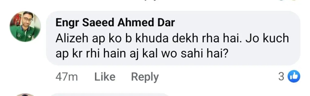 علیزے شاہ نے مزید کہا، ’خدا سب دیکھ رہا ہے‘۔ علیزے شاہ کا جواب اب سوشل میڈیا پر وائرل ہے اور صارفین ملے جلے ردعمل دیتے دکھائی دے رہے ہیں۔