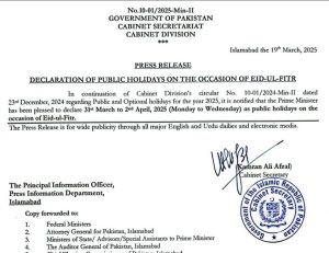 وفاقی حکومت نےعید الفطر کی تعطیلات کا اعلان کردیا