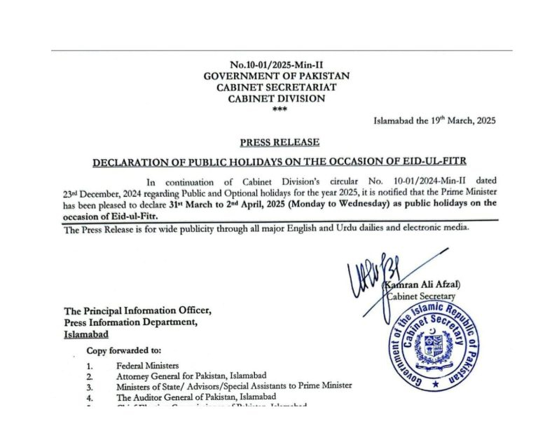 وفاقی حکومت نے عید الفطر پر چھٹیوں کا اعلان کردیا