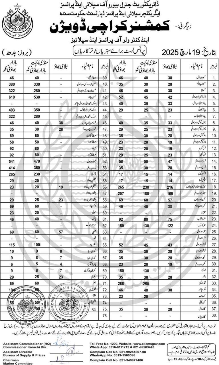 کمشنر کراچی کے جاری کردہ نرخوں کے مطابق مختلف سبزیوں کی قیمتیں مقرر کی گئی ہیں، جن میں درجہ اول، درجہ دوم اور درجہ سوم کی درجہ بندی شامل ہے۔ تمام سبزیوں کے نرخوں کی مکمل فہرست عوامی دسترس میں موجود ہے تاکہ صارفین کسی بھی غیر قانونی منافع خوری یا اضافی قیمت وصولی کی نشاندہی کر سکیں۔