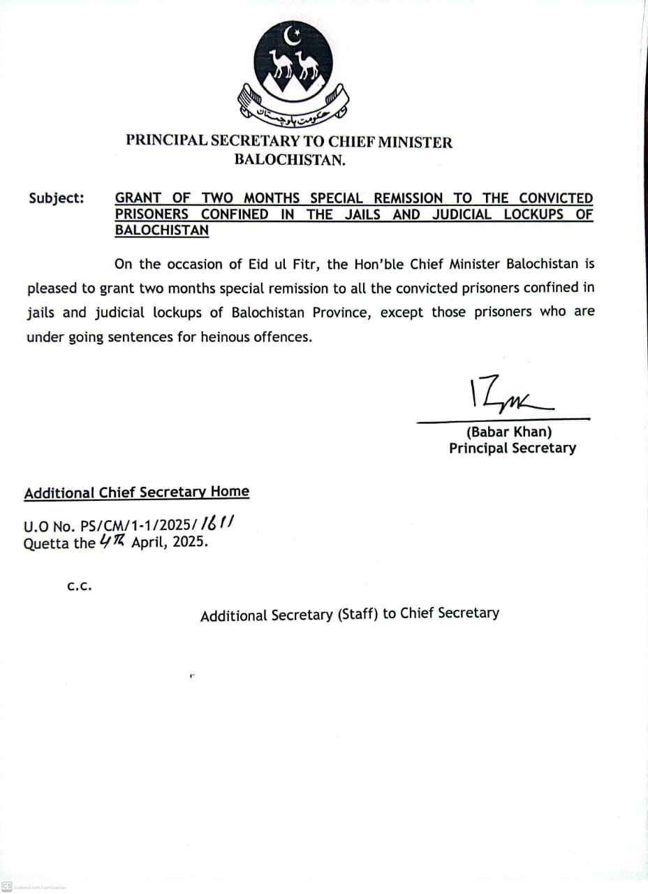 وزیر اعلیٰ بلوچستان کا قیدیوں کے لیے دو ماہ کی خصوصی معافی کا اعلان