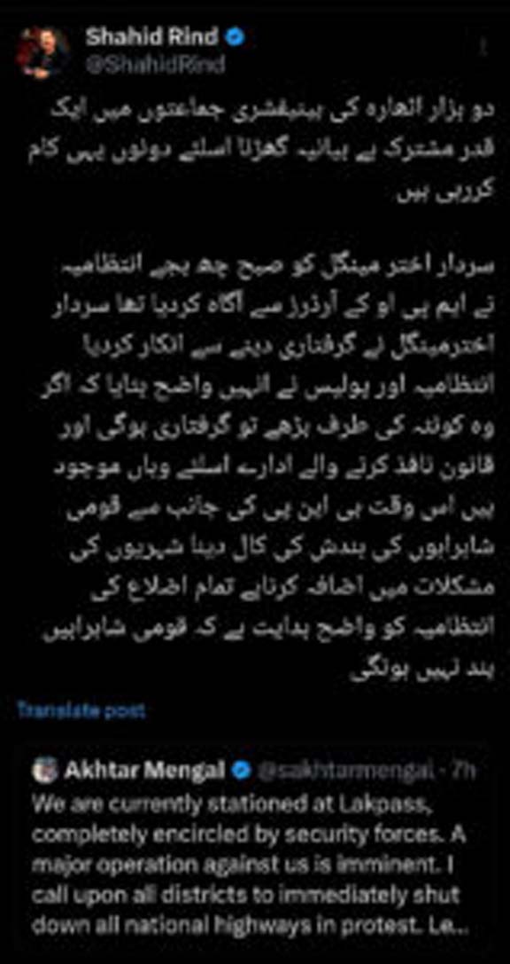 سردار اخترمینگل نے گرفتاری دینے سے انکار کردیا انتظامیہ اور پولیس نے انہیں واضح بتایا کہ اگر وہ کوئٹہ کی طرف بڑھے تو گرفتاری ہوگی اور قانون نافذ کرنے والے ادارے اسلئے وہاں موجود ہیں اس وقت بی این پی کی جانب سے قومی شاہراہوں کی بندش کی کال دینا شہریوں کی مشکلات میں اضافہ کرناہے۔ شاہد رند نے کہا ہے کہ تمام اضلاع کی انتظامیہ کو واضح ہدایت ہے کہ قومی شاہراہیں بند نہیں ہونگی