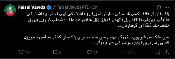 سینیٹر فیصل واوڈا نے سماجی رابطے کی ویب سائٹ ایکس (ٹوئٹر) پر جاری اپنے ایک بیان میں کہا کہ میں ملک سے باہر ہوں، مئی کے مہینے میں پاکستان کے لیے مثبت خبریں سامنے آئیں گی، یہ مثبت خبریں ہمیشہ کی طرح سیاسی جمہوری لاشوں کی طرف سے نہیں بلکہ کہیں اور سے آئیں گی۔