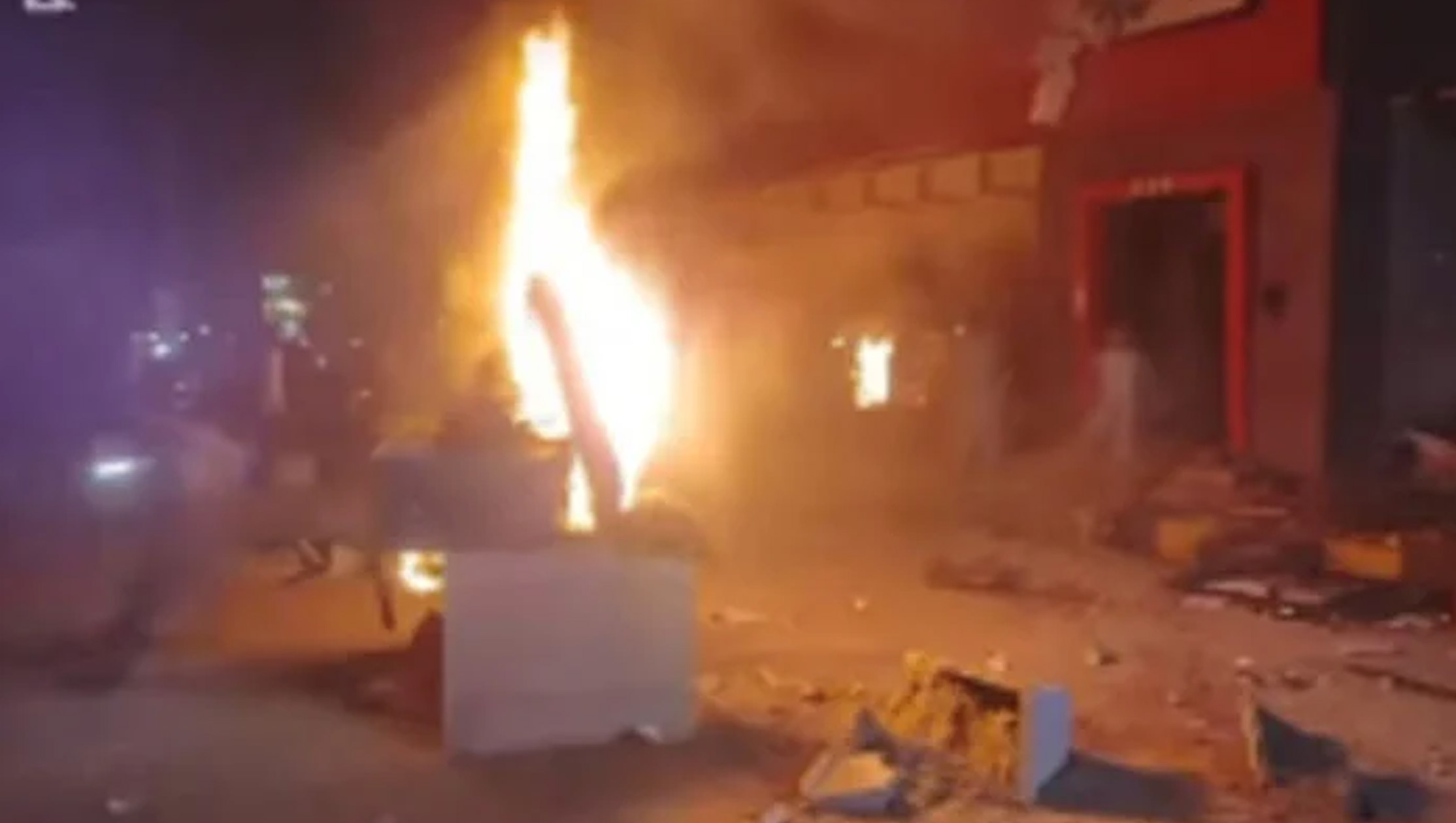 مشتعل افراد نے فرنچائز پر پتھراؤ اور توڑ پھوڑکے بعد اسے آگ لگادی۔