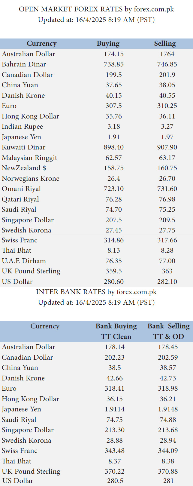 آج کے غیرملکی کرنسیوں کے تبادلہ ریٹس، 16 اپریل 2025