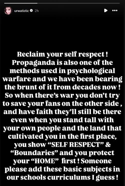 عروہ نے اپنی اسٹوری میں لکھاکہ پروپیگنڈا ایک ایسا ہتھیار ہے جو جنگوں میں استعمال ہوتا ہے اور بدقسمتی سے ہم اس کا شکار دہائیوں سے ہوتے آ رہے ہیں۔ جب جنگ ہو، تو آپ کو اپنی خودداری کا خیال رکھنا چاہیے اور اپنی قوم کے ساتھ کھڑے ہونا چاہیے۔