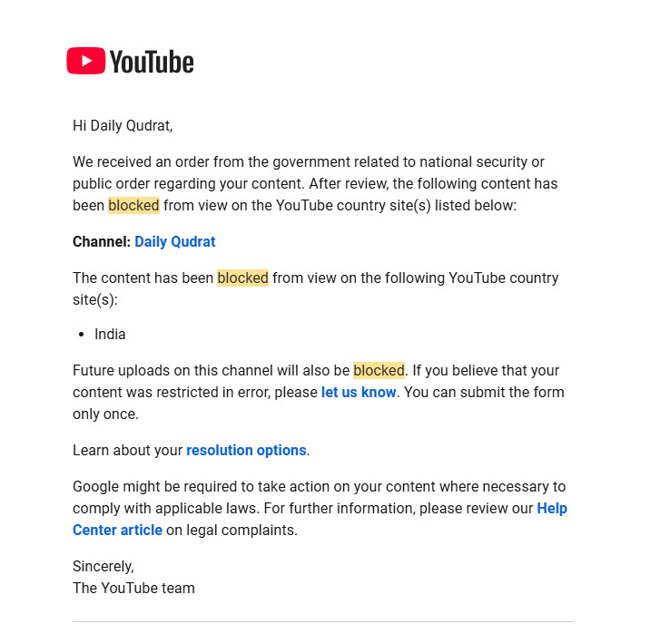 انڈین حکومت نے “ڈیلی قدرت” یوٹیوب چینل کو بھارت میں بلاک کردیا