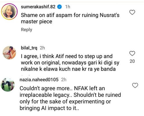سوشل میڈیا پر اس معاملے پر مداحوں کی رائے منقسم ہے۔ کچھ لوگ عاطف کے حق میں ہیں اور اسے ایک تخلیقی کاوش قرار دے رہے ہیں، جبکہ دوسرے فلک شبیر کی حمایت کرتے ہوئے کہہ رہے ہیں کہ نصرت فتح علی خان کے شاہکار گانوں کو چھیڑنا مناسب نہیں۔