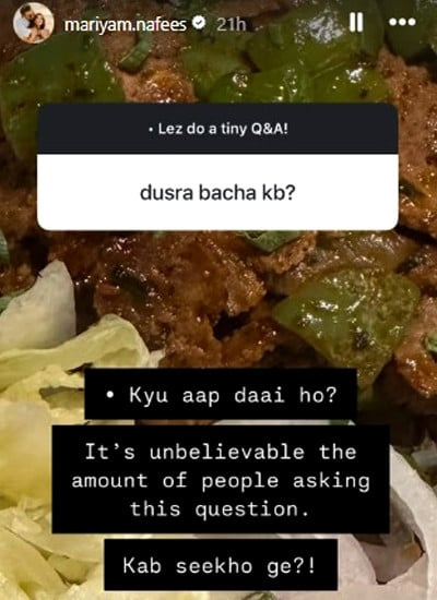 انسٹا صارف نے مریم نفیس سے سوال کیا تھا کہ ’’دوسرا بچہ کب؟‘‘ جس پر بھڑک پر مریم نفیس نے جواب دیا کہ ’’کیا آپ دائی ہیں؟‘‘