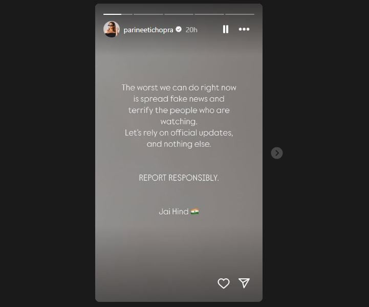 بھارتی میڈیا کو اب پاکستان مخالف پروپیگنڈہ کرنے اور جھوٹی خبریں پھیلانے پر ان کی اپنی ہی اہم شخصیات کی جانب سے تنقید کا سامنا کرنا پڑ رہا ہے۔ حال ہی میں اداکارہ پرینیتی چوپڑا نے بھی اپنے میڈیا اداروں پر تنقید کی ہے۔ اپنی انسٹاگرام اسٹوری میں اداکارہ پرینیتی چوپڑا نے کہا کہ اس وقت سب سے زیادہ نقصان دہ عمل غیر مصدقہ اور گمراہ کن معلومات پھیلانا ہے، جو عوام میں خوف اور بے یقینی پیدا کر رہا ہے۔