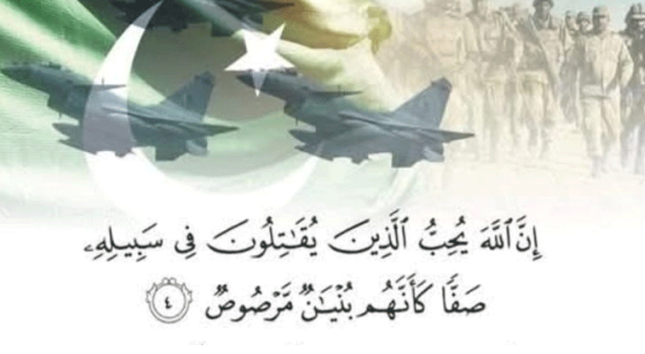 بیشک اللہ اُن لوگوں سے محبت کرتا ہے جو اُس کی راہ میں صف بستہ ہو کر اس طرح لڑتے ہیں جیسے وہ سیسہ پلائی ہوئی دیوار ہوں