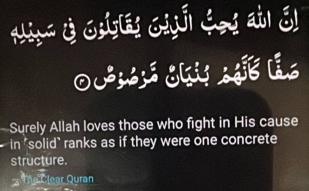 اس سورہ (آیت 4) میں اللہ تعالیٰ فرماتا ہے کہ”إِنَّ اللَّهَ يُحِبُّ الَّذِينَ يُقَاتِلُونَ فِي سَبِيلِهِ صَفًّا كَأَنَّهُمْ بُنْيَانٌ مَرْصُوصٌ” ترجمہ:-”بیشک اللہ اُن لوگوں سے محبت کرتا ہے جو اُس کے راستے میں اس طرح صف بستہ ہو کر لڑتے ہیں گویا کہ وہ سیسہ پلائی ہوئی دیوار ہیں۔”