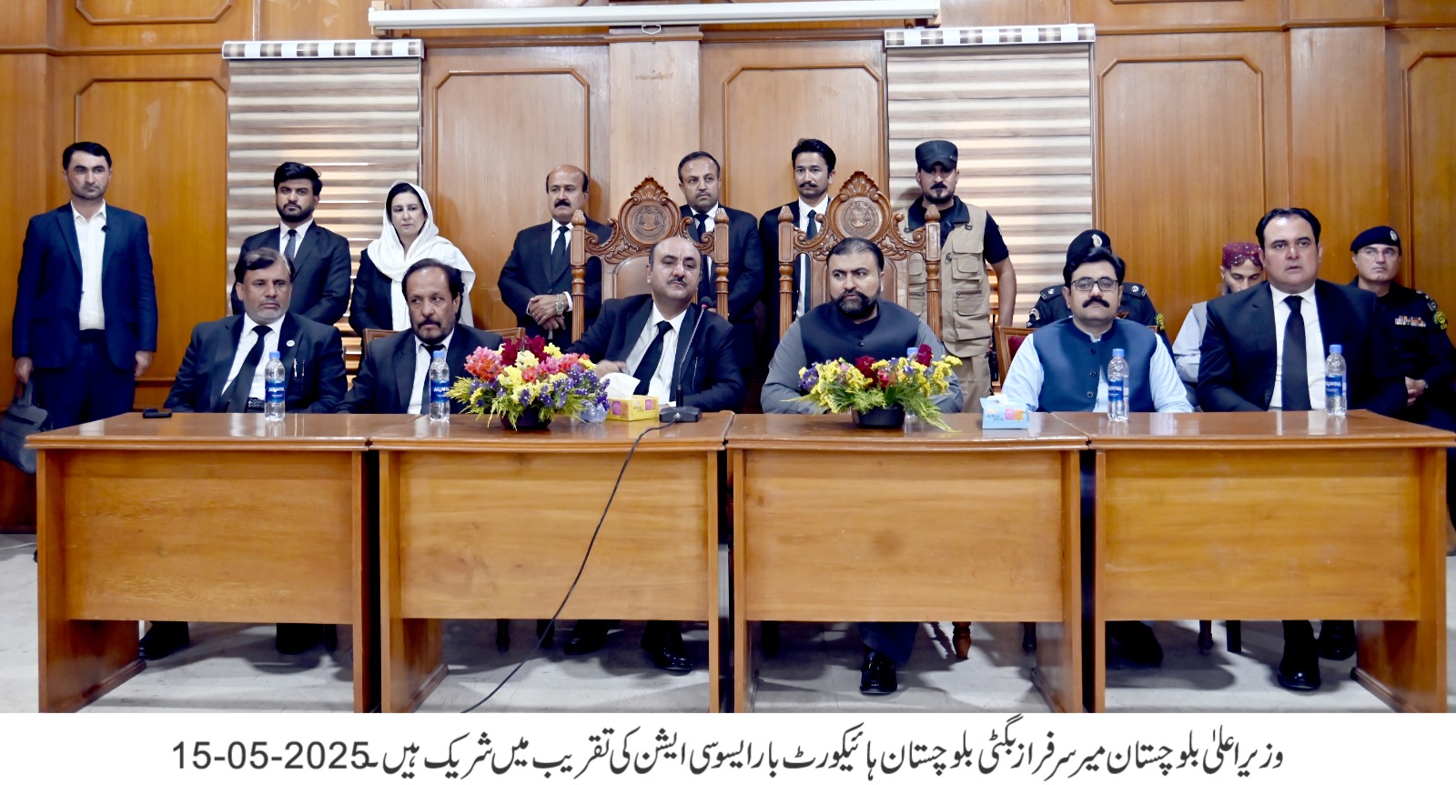 اس موقع پر صدر سپریم کورٹ بار ایسوسی ایشن پاکستان میاں روف عطا، صدر بلوچستان ہائیکورٹ بار ایسوسی ایشن میر عطا اللہ لانگو نے بھی خطاب کیا اپنے خطاب میں وزیر اعلی میر سرفراز بگٹی نے کہا کہ کوئٹہ میں اسکول، کالج، عدالتیں آج آباد ہیں لیکن دہشت گرد غائب و برباد ہیں یہ ہماری ریاست کی کامیابی ہے انہوں نے کہا کہ میری ہمیشہ خواہش رہی کہ قانون کے رکھوالوں سے براہ راست ملاقات ہو بلوچستان کے وکلا نے دہشت گردی کے خلاف جنگ میں بے پناہ قربانیاں دی ہیں اور ان کی خدمات ناقابل فراموش ہیں۔