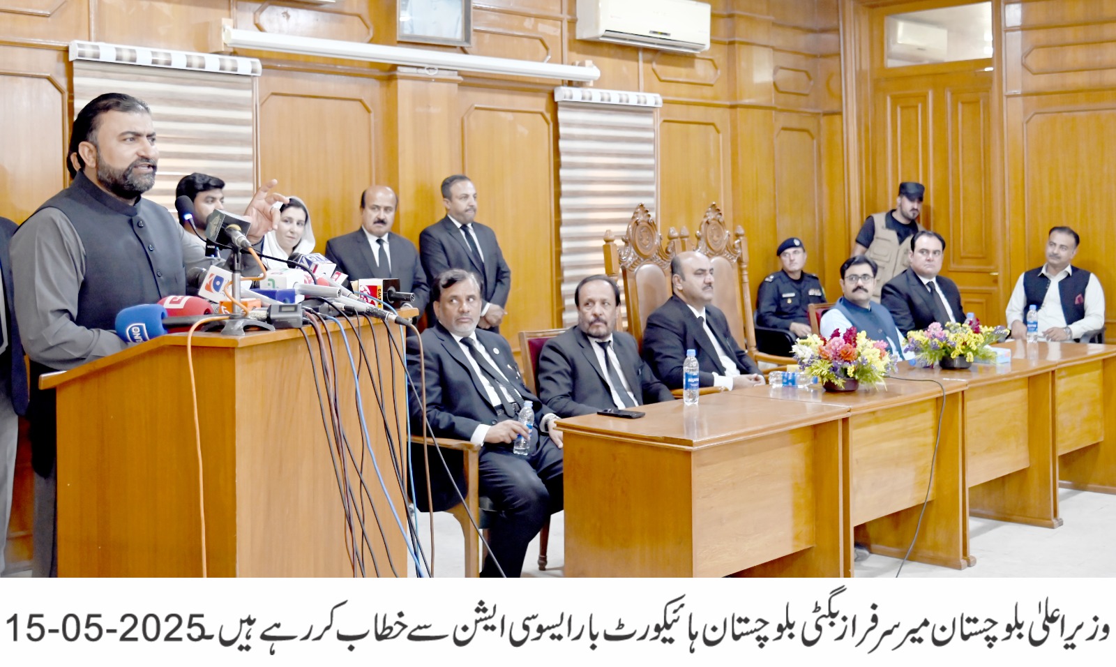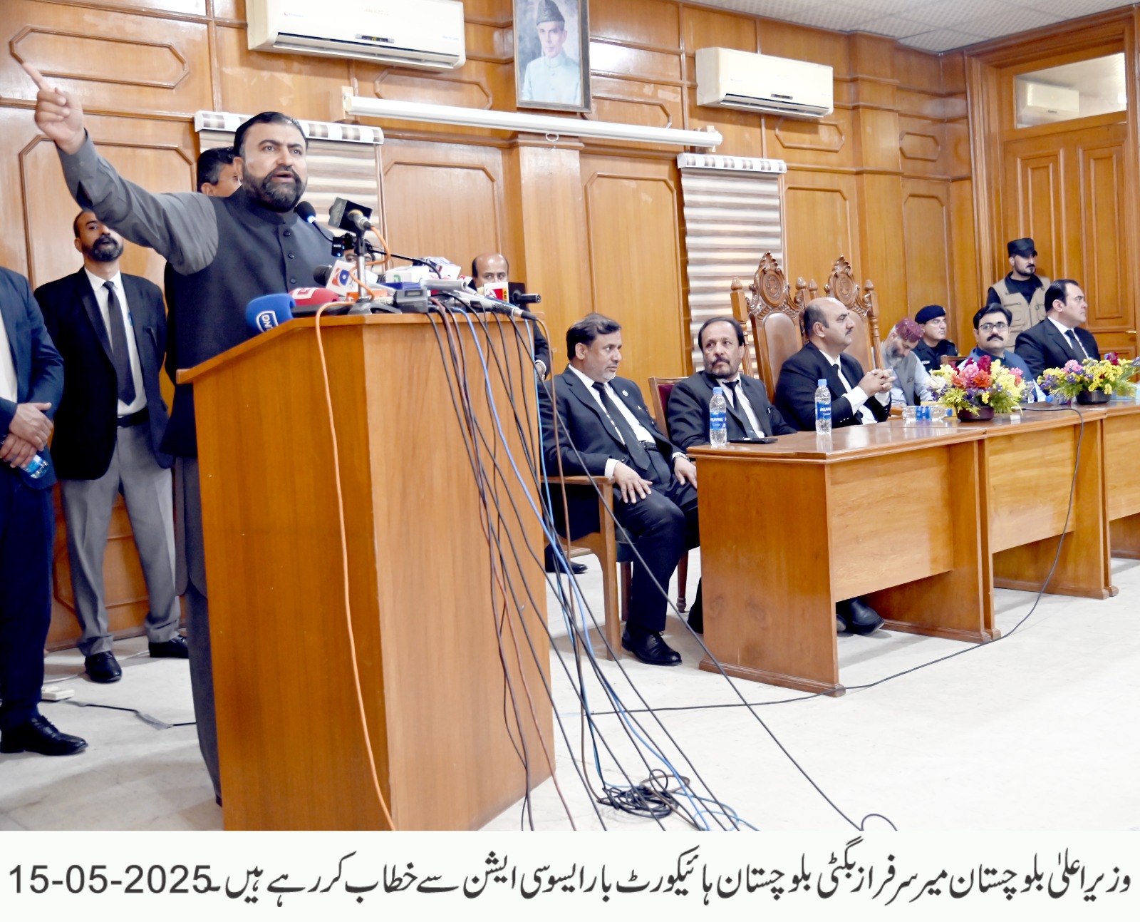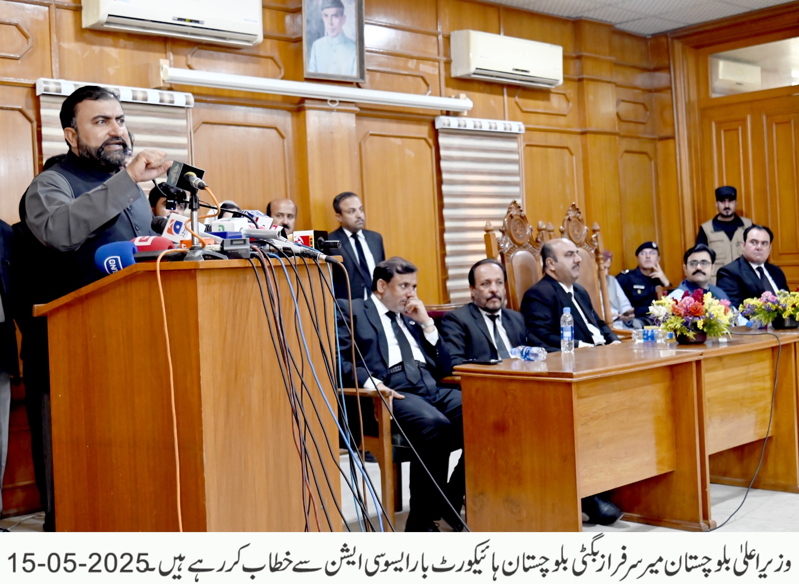انہوں نے کہا کہ اندرون بلوچستان وکلا کی بہبود کیلئے قابل عمل اقدامات اٹھائے جائیں گے انہوں نے کہا کہ بلوچستان میں ترقی کا سفر جاری ہے سڑکیں تعمیر ہو رہی ہیں فاصلے سمٹ رہے ہیں بیڈ گورننس اور کرپشن دہشت گردی کو جنم دیتی ہے اس کا خاتمہ ہماری ترجیح ہے احتجاج ہر شہری کا حق ہے لیکن اس کے لیے جگہ کے تعین کا اختیار حکومت کا ہے ہمارے باغی افغانستان میں حکومتی سرپرستی میں رہ رہے ہیں، گڈ اور بیڈ عسکریت پسندوں کا فرق ختم ہوگیا ہے پاکستان دنیا کا واحد ملک ہے جو علیحدگی پسند تحریکیوں کو برداشت کرتا ہے وزیر اعلی نے وکلا پر زور دیا کہ وہ قانون و انصاف کے علمبردار بنیں اور انتہا پسندی کے بجائے آئینی راستوں کو اپنائیں تاکہ بلوچستان میں پائیدار امن اور ترقی کا خواب شرمندہ تعبیر ہو سکے تقریب میں صوبائی وزیر صحت بخت محمد کاکڑ، ایڈووکیٹ جنرل بلوچستان عدنان بشارت بھی موجود تھے۔