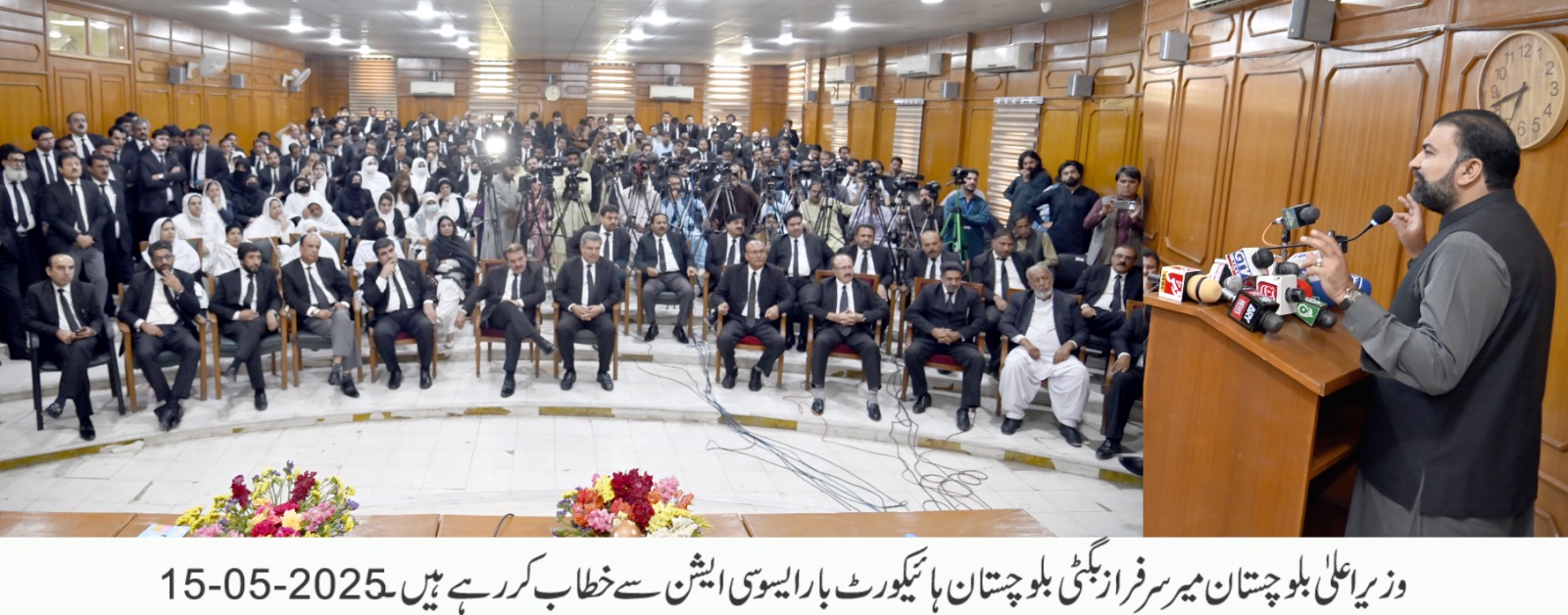معصوم شہریوں کا قتل کسی بھی بلوچ ثقافت کا حصہ نہیں ہو سکتا ہم حکومت کی حیثیت سے ہمیشہ مظلوم کے ساتھ کھڑے ہیں بی وائی سی کے جلسے آئین کے مطابق نہیں وزیر اعلی نے سوال کیا کہ بشیر زیب جیسے افراد کو یہاں آ کر تقریر کی اجازت دی جا سکتی ہے؟ یقینا پاکستان کا قانون اس بات کی اجازت نہیں دیتا وزیر اعلی نے کہا کہ سعید بادینی جیسے دہشتگرد نے خود کش حملے کیے میں نے اس کا انٹرویو کیا اس نے ہمیں مرتد کہا اور ہمارے قتل کی سازش کا اعتراف کیا میر سرفراز بگٹی نے اس موقع پر بلوچستان ہائیکورٹ بار ایسوسی ایشن کے وکلا کے لئے پانچ کروڑ روپے کی گرانٹ، وکلا ہاسنگ اسکیم، ہیلتھ انشورنس، لائیبریری، خواتین وکلا کے لیے پنک سکوٹیز اور پنک وین، اور وکلا کے لیے شٹل سروس بسوں کی فراہمی کا اعلان بھی کیا جبکہ بلدیہ پلازہ میں مناسب کرائے پر چیمبرز اور دفاتر کی فراہمی کی یقین دہانی بھی کرائی۔