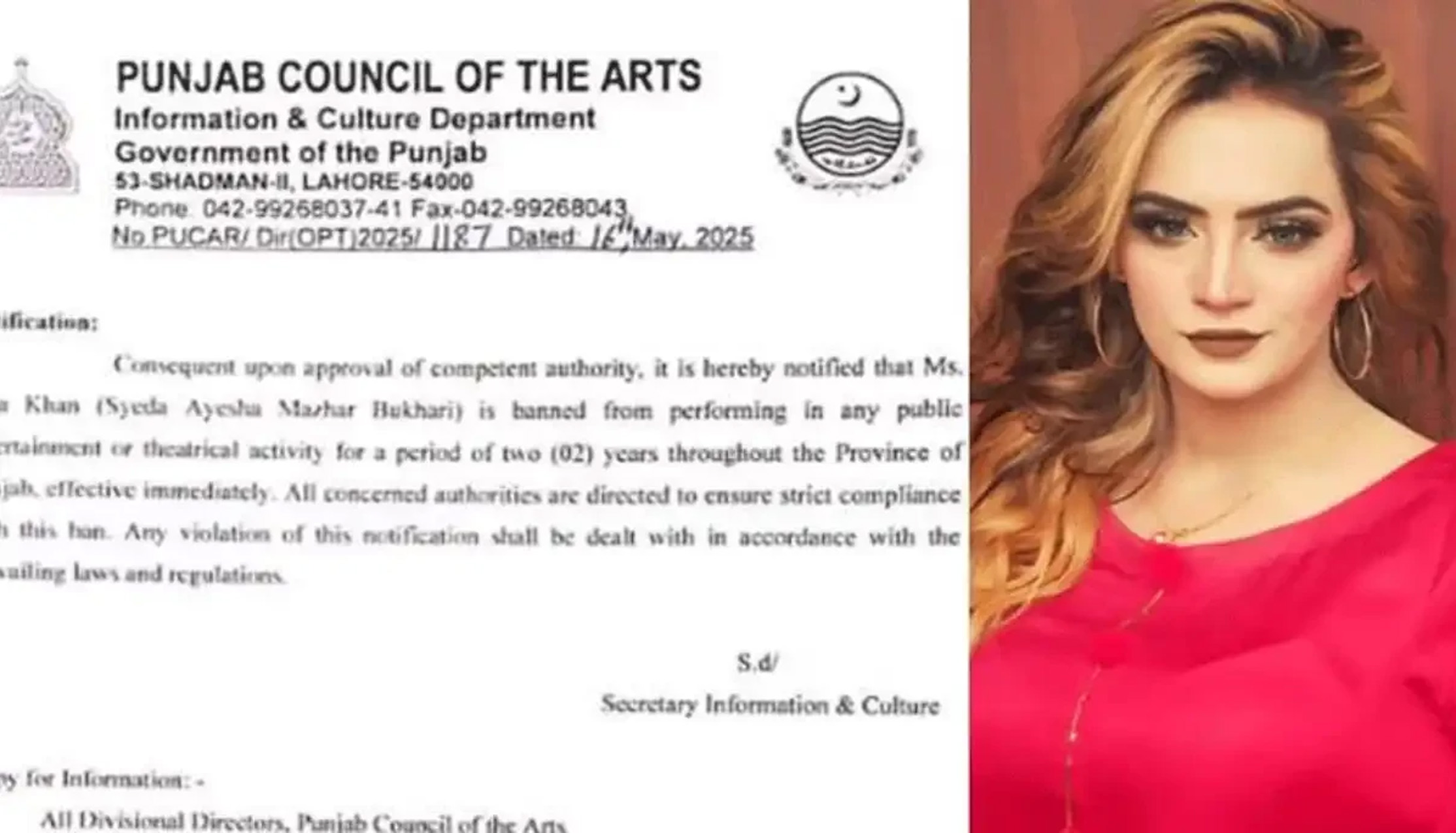 نوٹیفیکیشن کے مطابق زارا خان اب دو سال تک پنجاب کے کسی تھیٹر میں پرفارم نہیں کر سکیں گی۔