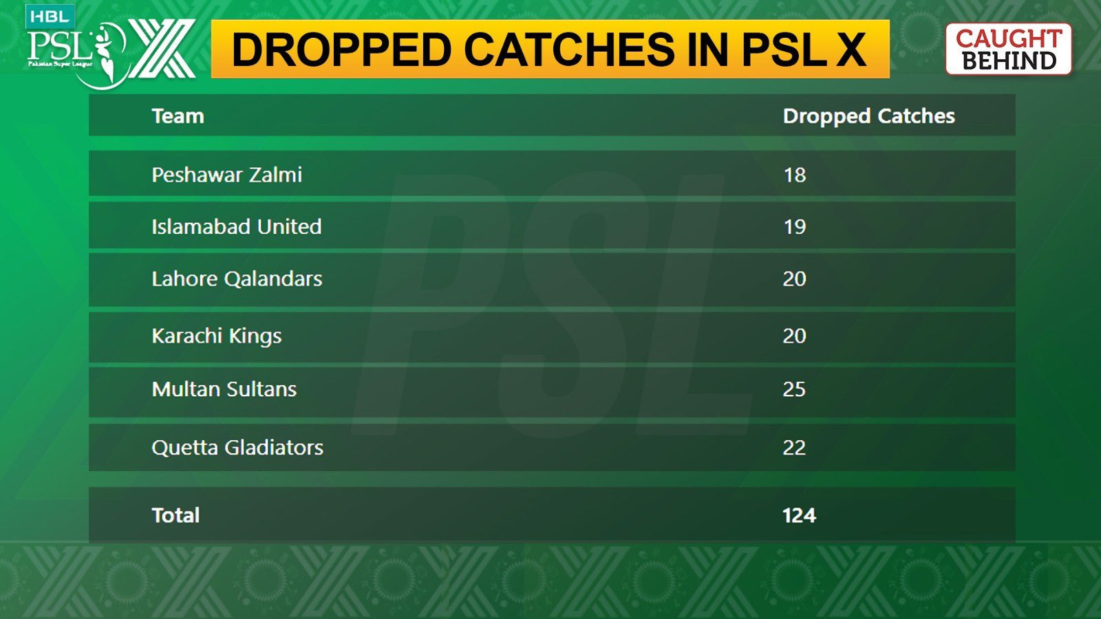 کوئٹہ گلیڈی ایٹرز کے فیلڈرز نے 22، لاہور قلندرز اور کراچی کنگز نے یکساں طور پر 20، 20 کیچز ڈراپ کیے۔