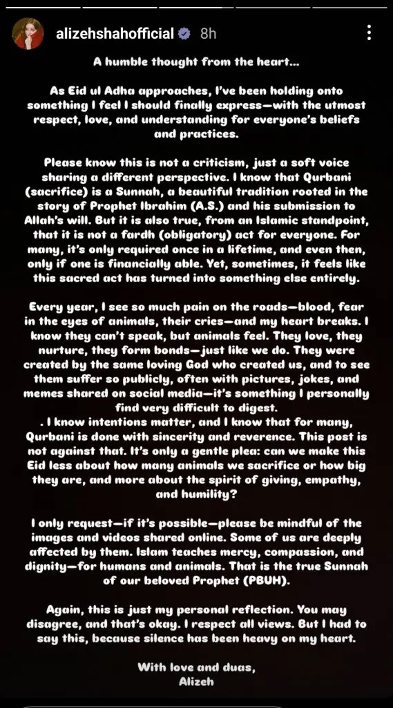 عیدالاضحی جیسے اہم اسلامی تہوار کے قریب آتے ہی علیزے شاہ نے انسٹاگرام پر قربانی کے طریقہ کار اور اس کی عوامی نمائش سے متعلق اپنی تشویش کا اظہار کیا۔