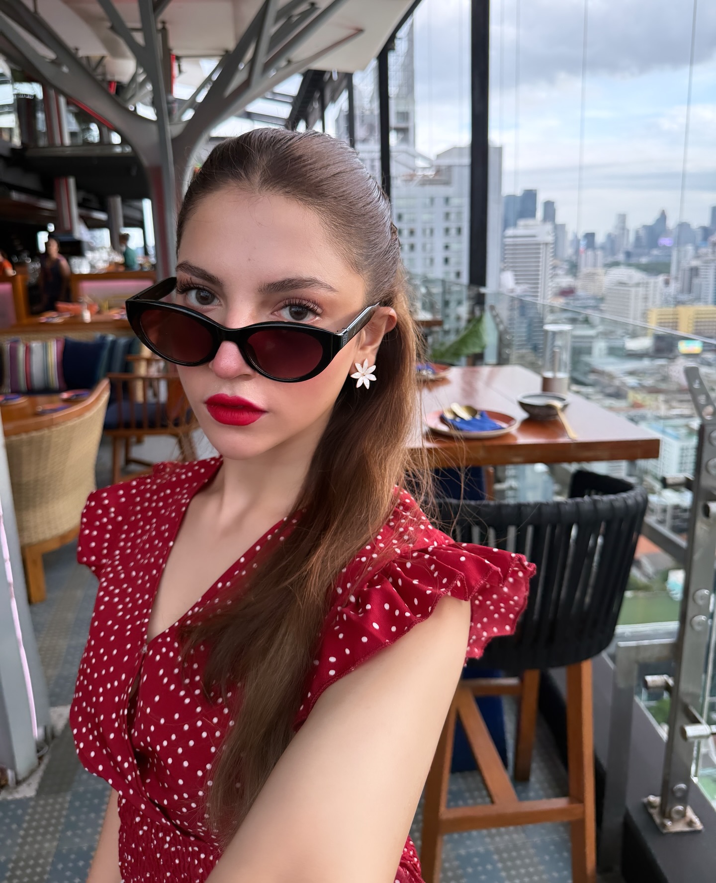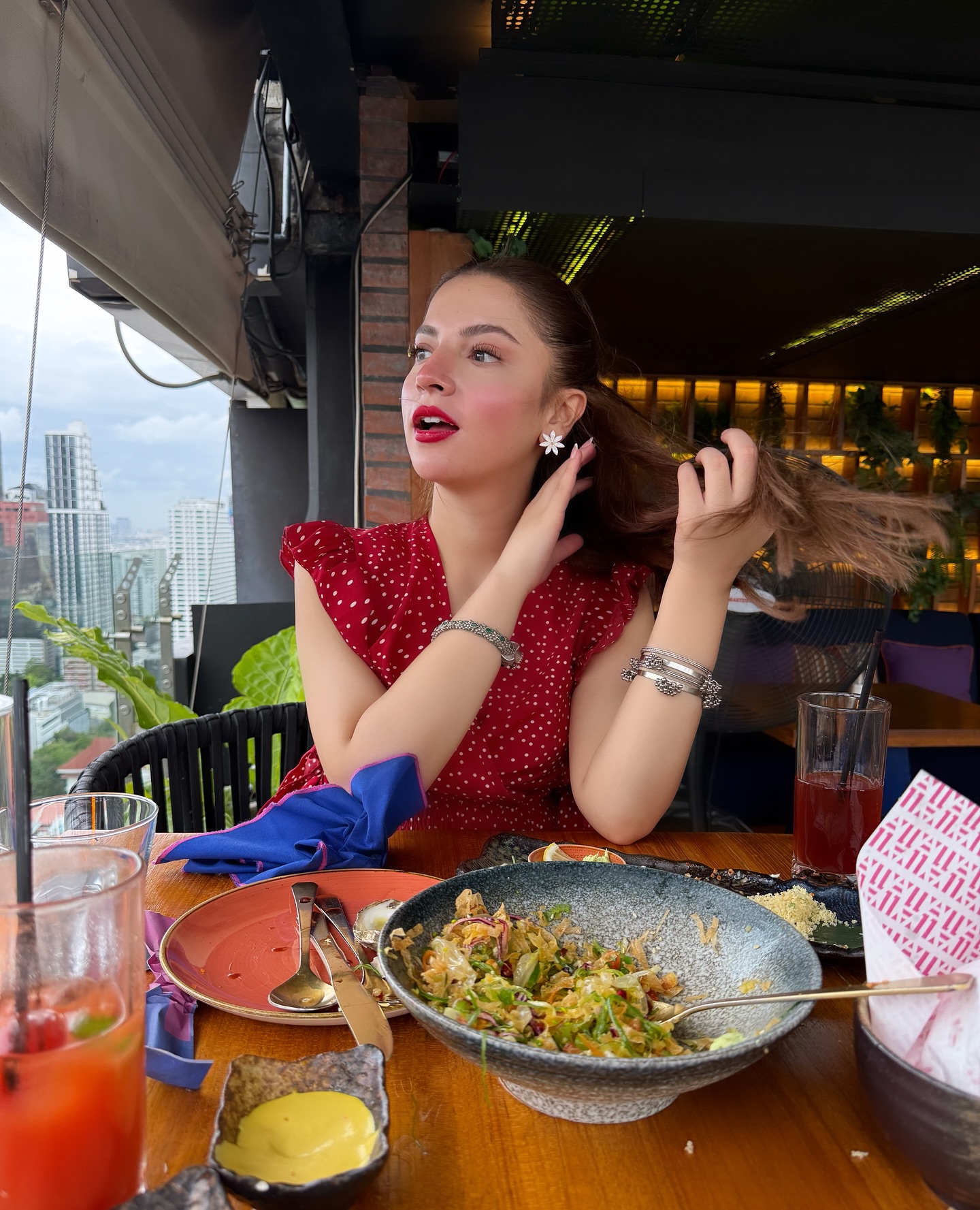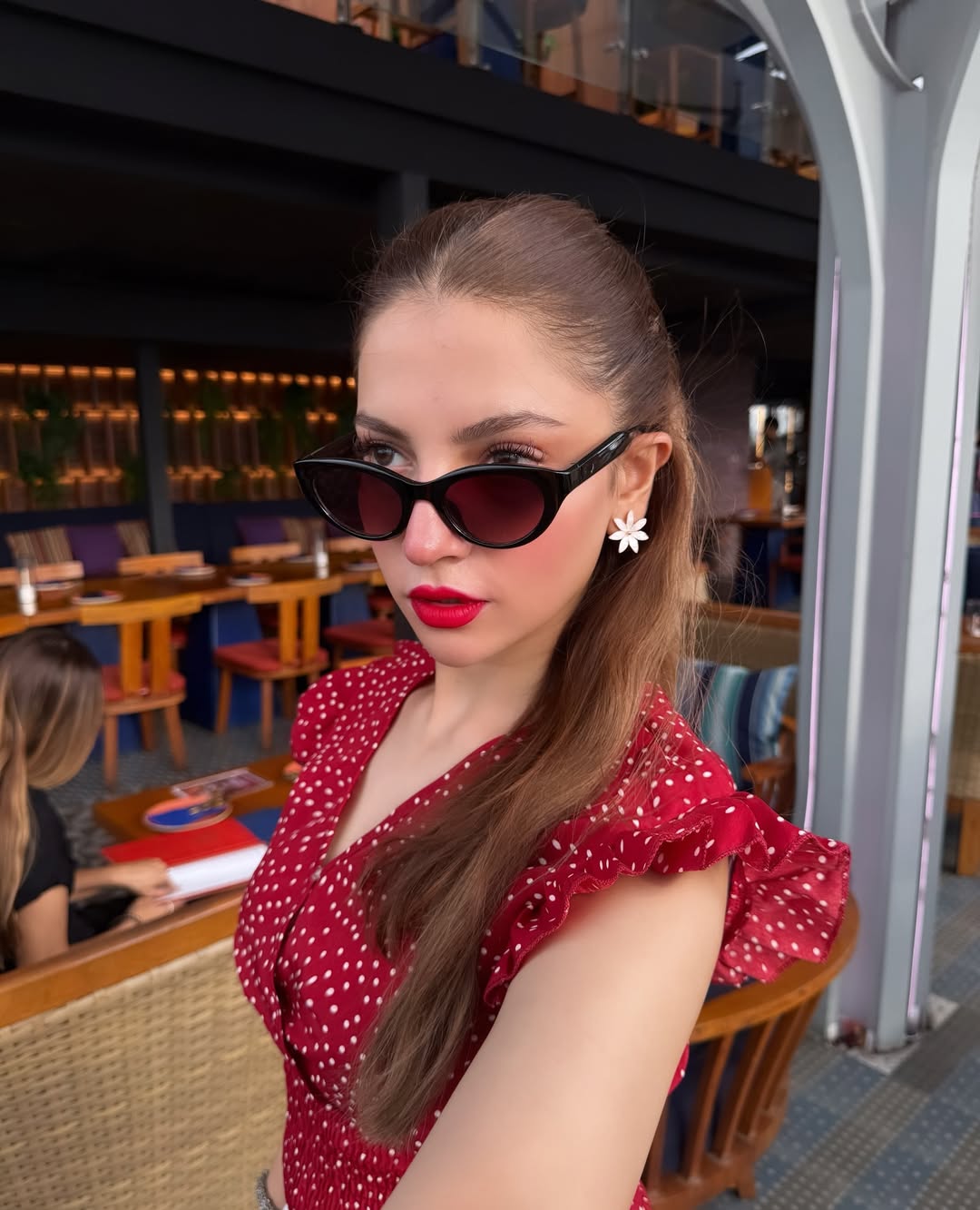 سرخ لپ اسٹک، آنکھوں پر اسٹائلش سیاہ گوگلز اور ہاتھوں میں سلور کڑوں نے انکے لُک کو مزید دلکش بنا دیا۔