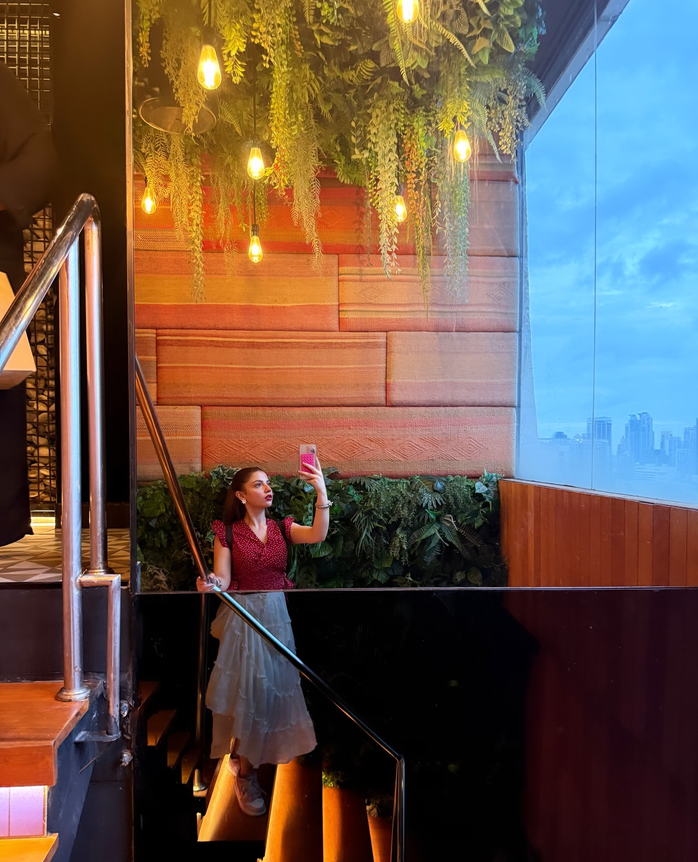 دنانیر نے اس آؤٹنگ کے لیے ریڈ اینڈ وائٹ پُولکا ڈاٹ ٹاپ کے ساتھ وائٹ سکرٹ پہن رکھی تھی جو ان پر خوب جچتی دکھی۔