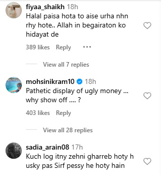 ویڈیوز سوشل میڈیا پر وائرل ہوئیں تو صارفین نے انہیں خوب تنقید کا نشانہ بنایا۔ ان کا کہنا تھا کہ اگر پیسہ حلال کا ہوتا تو اس طرح نہ اڑایا جاتا جبکہ کئی صارفین کا کہنا تھا کہ یہ عقیقہ نہیں ہے اور نہ ہی سنت کا طریقہ ہے۔ محسن اکرام نے لکھا کہ دولت کی نمائش کیوں کی جا رہی ہے۔