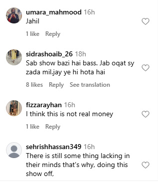 ایک صارف نے لکھا کہ جب اوقات سے زیادہ مل جائے تو یہی ہوتا ہے جبکہ کئی صارفین کا کہنا تھا کہ عقیقہ پر اڑائے جانے والے پیسے نقلی ہیں۔