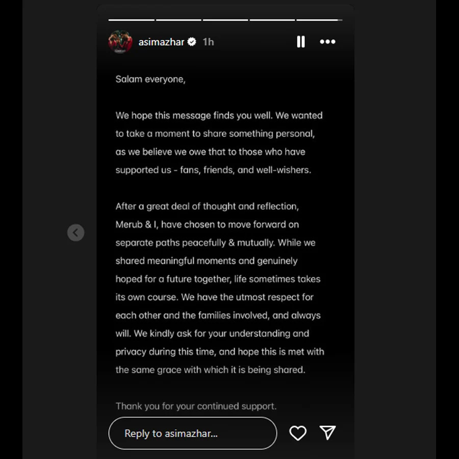 عاصم اظہر نے بدھ اور جمعرات کی درمیانی شب انسٹاگرام اسٹوری کے ذریعے یہ اعلان کرتے ہوئے کہا کہ “میرب اور میں نے سوچ بچار اور غور و فکر کے بعد باہمی رضامندی سے اپنی راہیں الگ کرنے کا فیصلہ کیا ہے۔