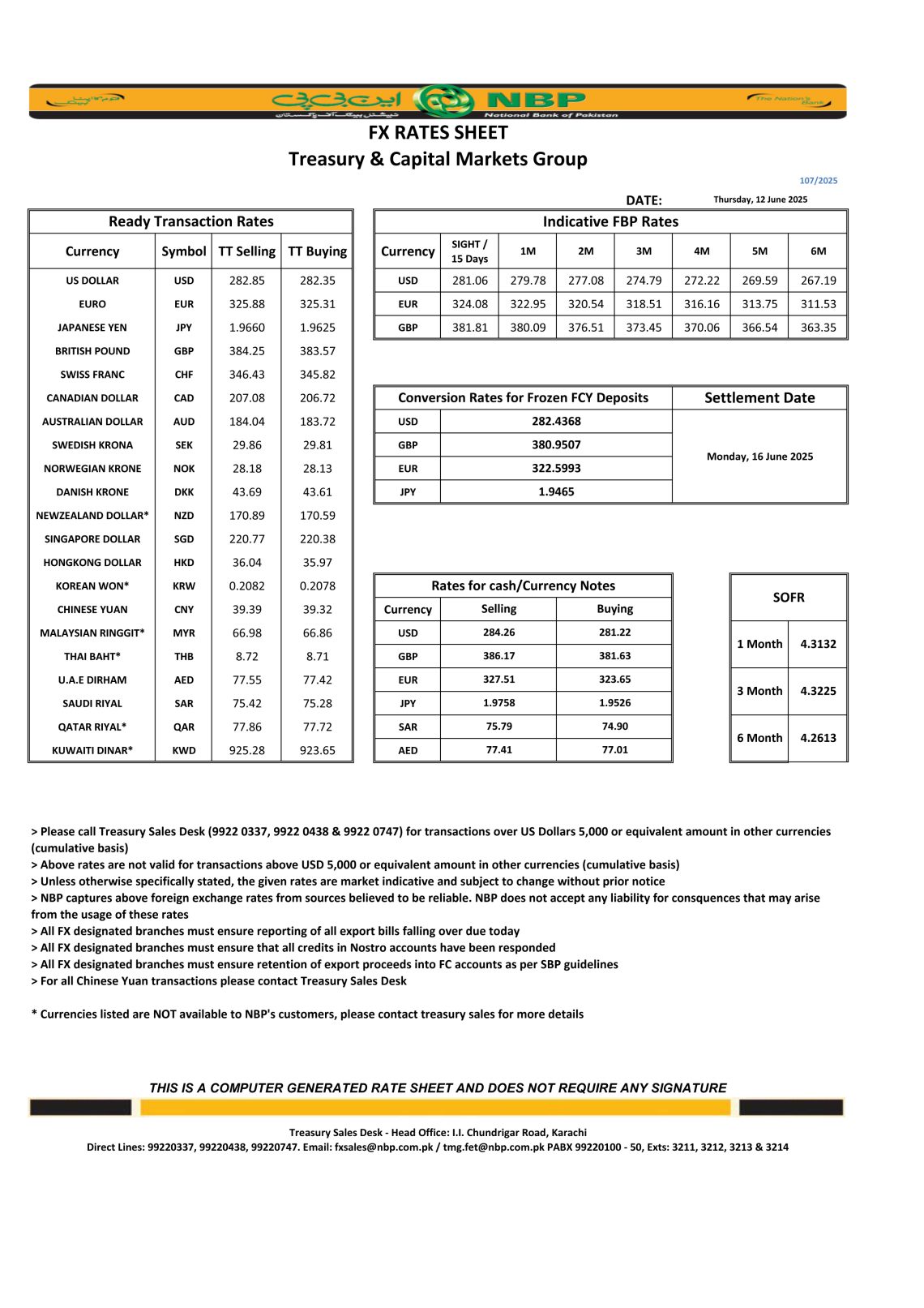نیشنل بینک آف پاکستان کی جانب سے 12 جون 2025 کے لیے جاری کردہ کرنسی ریٹس درج ذیل ہیں: