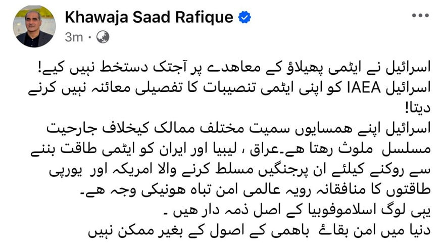 خواجہ سعد رفیق نے سوشل میڈیا پر اپنی ایک پوسٹ میں ایران کے جوہری پروگرام کو بنیاد بنا کر اسرائیلی حملوں کی مذمت کی۔