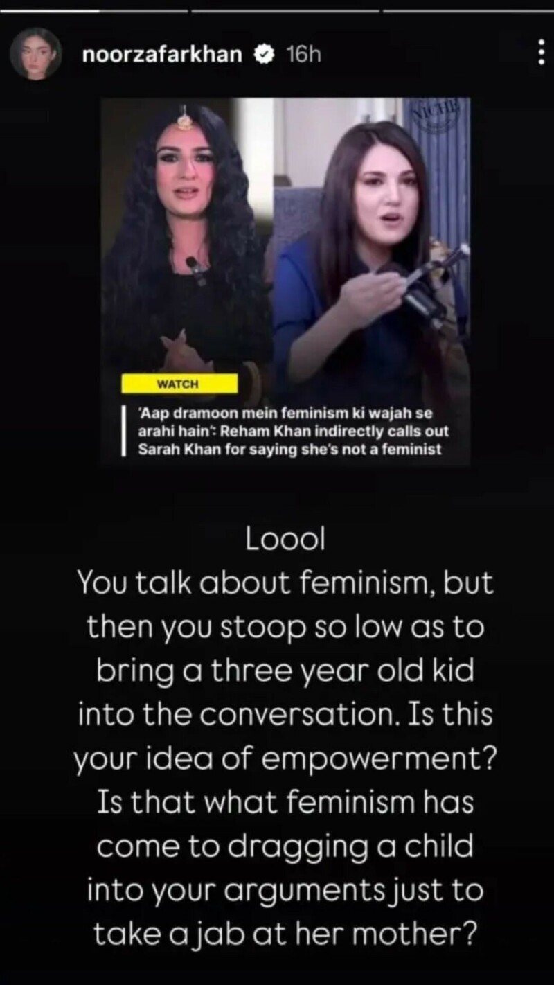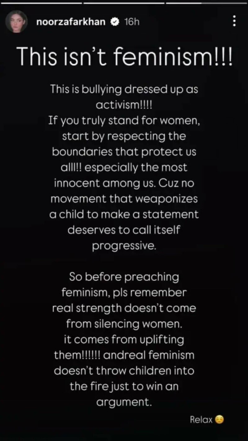 انہوں نے انسٹاگرام اسٹوری میں لکھا کہ آپ خود فیمنزم کی بات کرتی ہیں لیکن ماں پر تنقید کرنے کے لیے اس کے بچے کو بھی شامل کر لیتی ہیں، جو کہ افسوسناک ہے۔