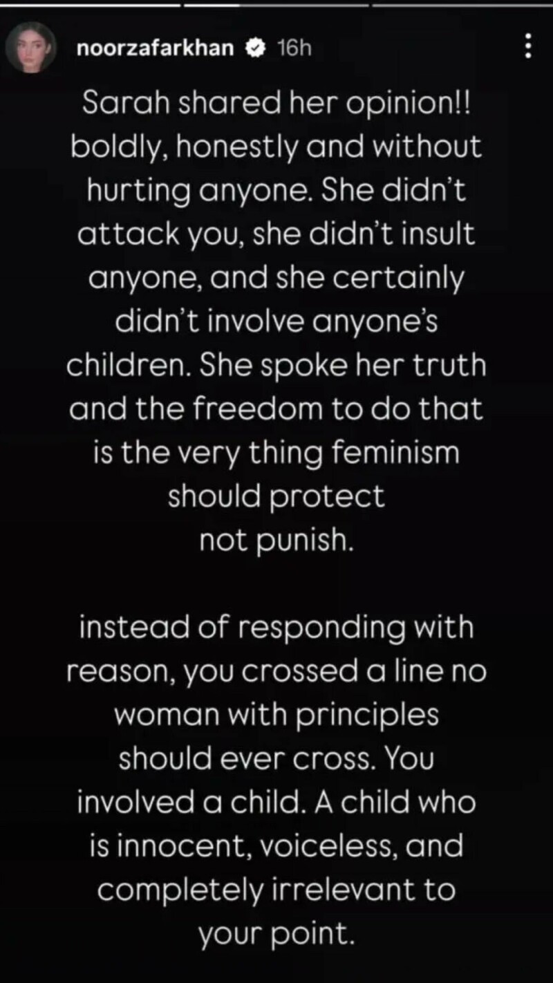 نور ظفر کے مطابق، سارہ نے صرف اپنی رائے دی تھی، نہ کسی کو نشانہ بنایا اور نہ ہی کسی کے بچوں کو شامل کیا، جب کہ سارہ پر تنقید کرنے کے لیے ایک معصوم بچی کو درمیان میں لایا گیا، تو کیا یہی فیمنزم ہے؟