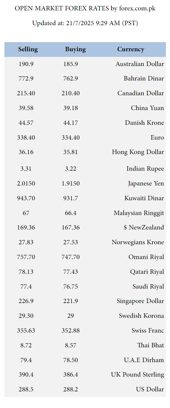 آج پیر 21 جولائی 2025 کو پاکستان میں غیر ملکی کرنسیوں کے ریٹس