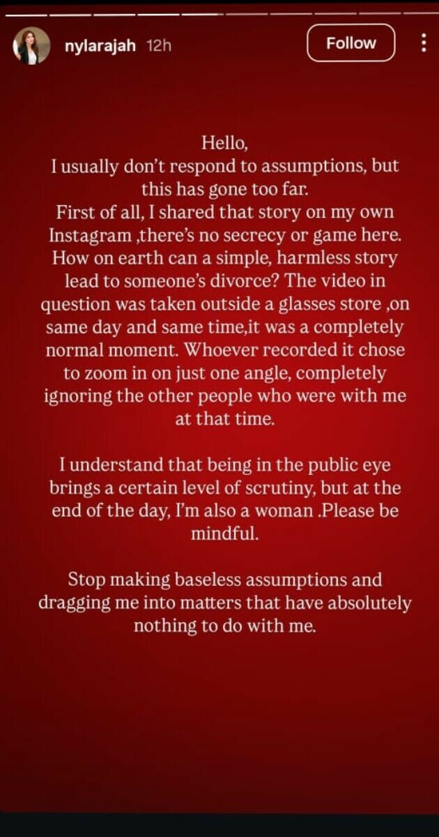 ان افواہوں کے جواب میں نائلہ راجہ نے بالآخر خاموشی توڑتے ہوئے ایک پرجوش اور واضح بیان جاری کیا، انہوں نے اپنے انسٹاگرام پر ایک تفصیلی پیغام میں کہا کہ یہ معاملہ اب حد سے بڑھ چکا ہے اور انہیں اپنی بات رکھنا ضروری ہو گیا ہے۔