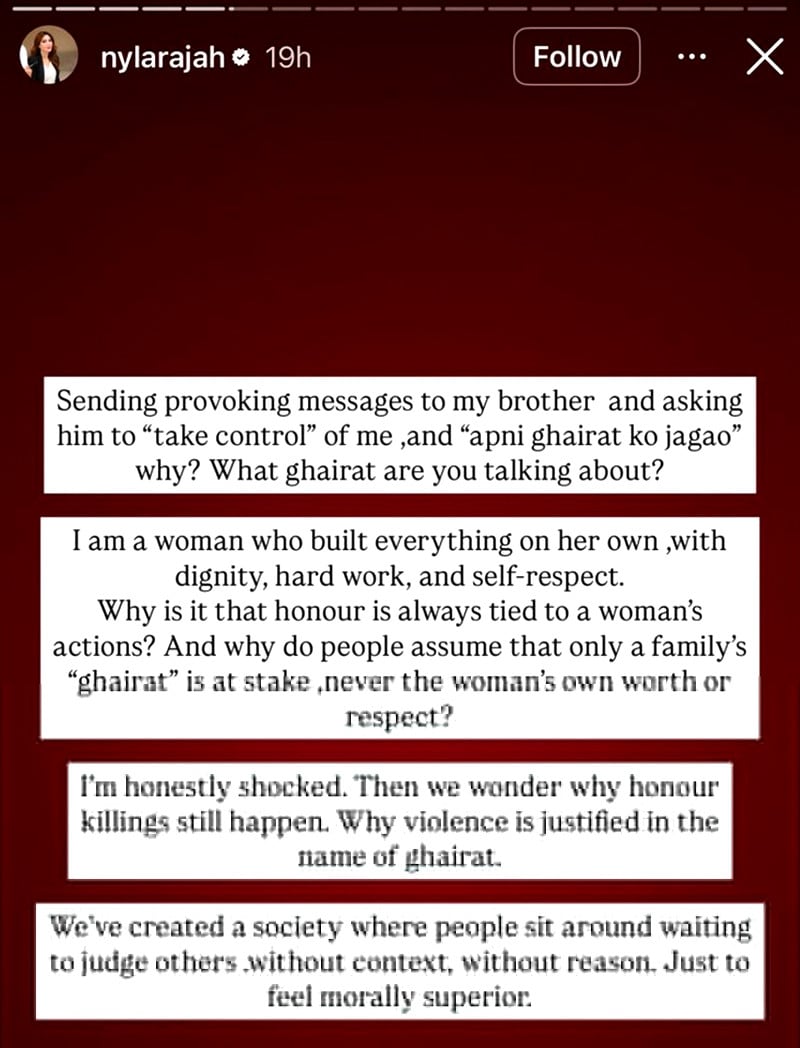 نائلہ نے انکشاف کیا کہ ان کے بھائی کو بھی اشتعال انگیز پیغامات موصول ہو رہے ہیں جن میں ان سے کہا جا رہا ہے کہ وہ اپنی بہن کو قابو کریں۔ اس پر شدید برہمی ظاہر کرتے ہوئے انہوں نے کہا کہ وہ ایک خوددار اور محنتی عورت ہیں جنہوں نے اپنی زندگی اپنی شرائط پر بنائی ہے۔ انہوں نے اپیل کی کہ لوگ ان کے وقار کا احترام کریں اور بے بنیاد الزامات سے گریز کریں۔
