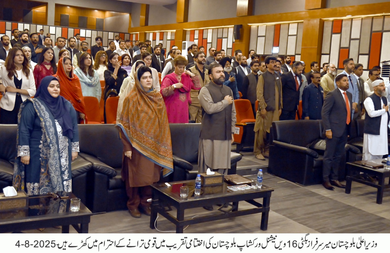 میری آپ سب سے گزارش ہے کہ ریاستی اداروں کے ساتھ ہم آہنگی، آئین و قانون کی پاسداری، اور باہمی احترام کو فروغ دیں اور اپنی تمام تر صلاحیتیں وطن کی خدمت کے لیے وقف کریں تقریب کے اختتام پر وزیر اعلیٰ بلوچستان میر سرفراز بگٹی نے شرکاء میں سرٹیفکیٹس تقسیم کیے اور نیشنل ورکشاپ کے منتظمین کو کامیاب انعقاد پر سراہا اس تقریب میں صوبائی وزیر تعلیم راحیلہ حمید خان درانی بھی موجود تھیں۔