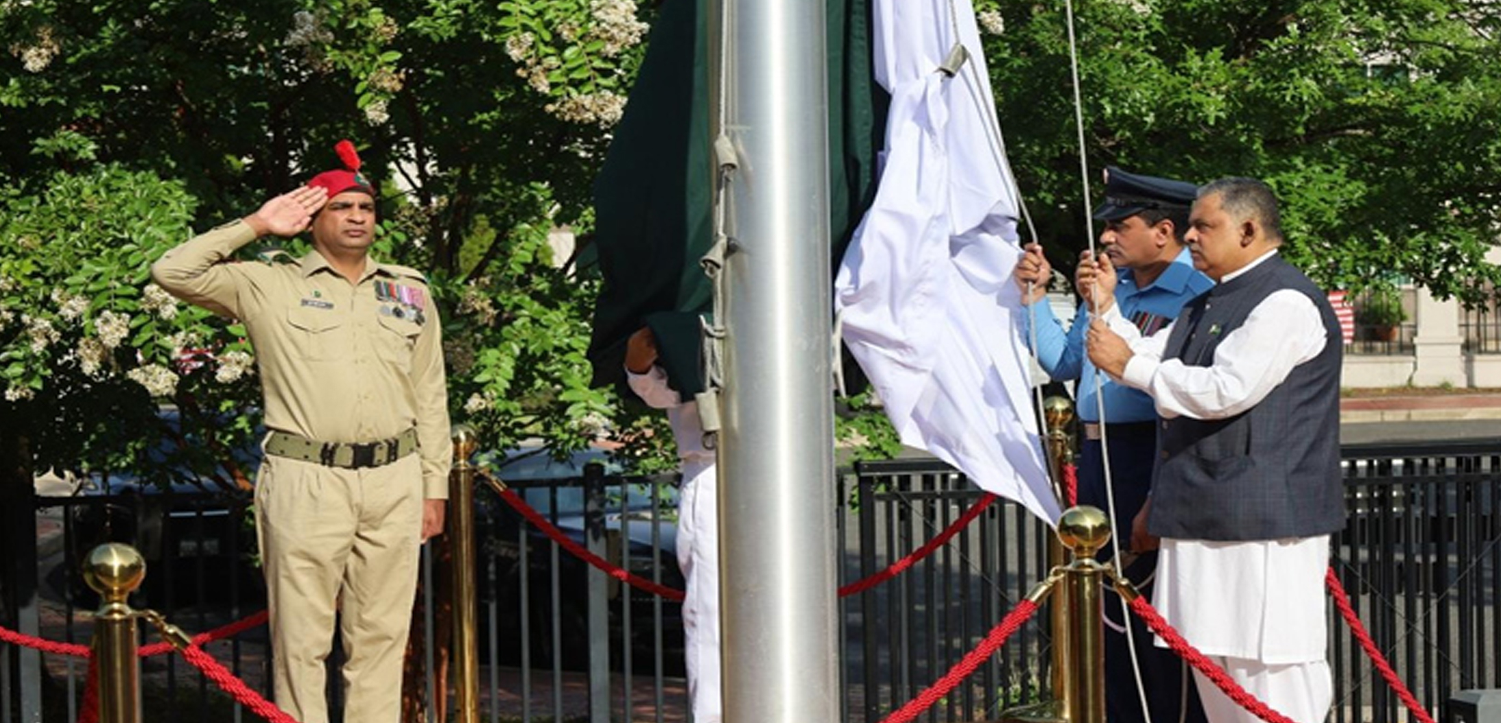 واشنگٹن ڈی سی میں پاکستان کے 78ویں یومِ آزادی اور “معرکۂ حق” کی مناسبت سے پرچم کشائی کی تقریب کا انعقاد کیا گیا۔ امریکا میں پاکستان کے سفیر رضوان سعید شیخ نے قومی ترانے کی دھن پر پرچم کُشائی کی۔