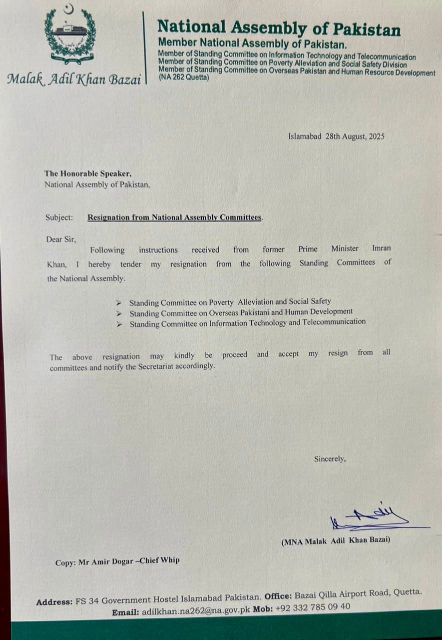 پی ٹی آئی کے ایم این اے عادل خان بازئی نے قائمہ کمیٹیوں سے استعفیٰ دے دیا