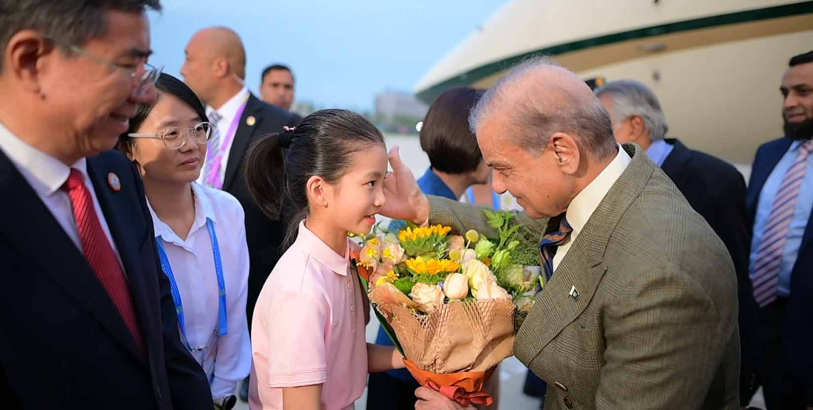 تیانجن پہنچنے پر وزیراعظم شہبازشریف کا ریڈکارپٹ استقبال کیا گیا، بچوں نے پھول پیش کیے، وزیراعظم شہبازشریف نے بچوں کو پیار کیا۔