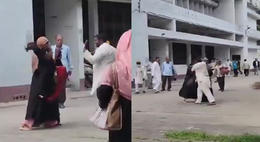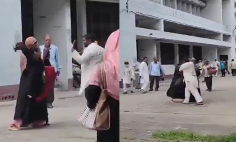 عدالت کے باہر سنسنی خیز مناظر؛ بیوی کی شوہر پر چپلوں کی بارش، ویڈیو دیکھیں